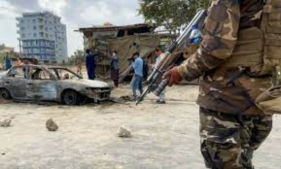 عنصر من طالبان يقف بالقرب من سيارة محترقة يفترض أنها استخدمت منصة لإطلاق الصواريخ على مطار كابل