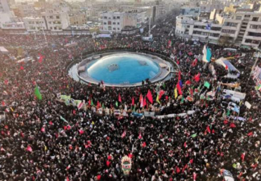 Portrait de leur héros souriant en main, la foule s'est amassée bien avant 08h00 (05h30 Heures belges) aux abords de l'Université de Téhéran, où le guide suprême iranien, l'ayatollah Ali Khamenei, doit présider dans la matinée une prière en l'honneur du soldat le plus populaire d'Iran. La foule compacte et noire qui stationne autour de l'université sous un soleil glacial ou qui défile sur plusieurs kilomètres le long des avenues Enghelab ("Révolution" en persan) et Azadi ("Liberté") agite moult drapeaux rouges (couleur du sang des "martyrs") ou iraniens, mais aussi des drapeaux libanais ou irakiens. Les rues résonnent par intermittence de slogans "Mort à l'Amérique", "Mort à Israël" .