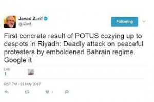 Sosyal medya hesabı Twitter üzerinden olaya karşı tepkisini dile getiren Zarif, şunları yazdı: ABD cumhurbaşkanının Riyad’ düzenlediği seferin ilk semeresi: Bahreyn rejim güçlerinin barışçıl gösteri düzenleyen protestoculara, öldüresine saldırı düzenlemesine neden oldu.