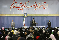 Imam Hamenei konuşmasını şöyle tamamladı: 'Kadınların sosyal hareketler, devrimler ve İslami uyanış sürecindeki rolü çok önemlidir. Zira kadınlar bir sosyal harekette bilinçli olarak yer aldıklarında o hareketin yükselişi ve zaferi garantilenmektedir. Bu gerçeklik kadınların Mısır, Libya, Bahreyn, Yemen ve İslam dünyasının başka noktalarında meydana gelen gelişmelerdeki katılımlarını sürdürüp güçlendirmeleri gerektiğini ortaya koymaktadır. İslami uyanış muhteşem bir harekettir ve önündeki tehlikeler iyi değerlendirildiği takdirde tarihin şimdiki çizgisini değiştirebilir. Emperyalistlerin kör kılıcı, milletlerin imanı karşısında hiç bir işe yaramayacaktır.'