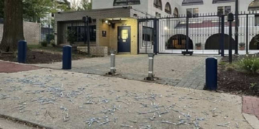 فلسطینی قیدیوں کی حمایت میں مظاہرہ کرنے والوں نے واشنگٹن میں اسرائیلی سفارت خانے پر درجنوں چمچے پھینکے ہیں۔