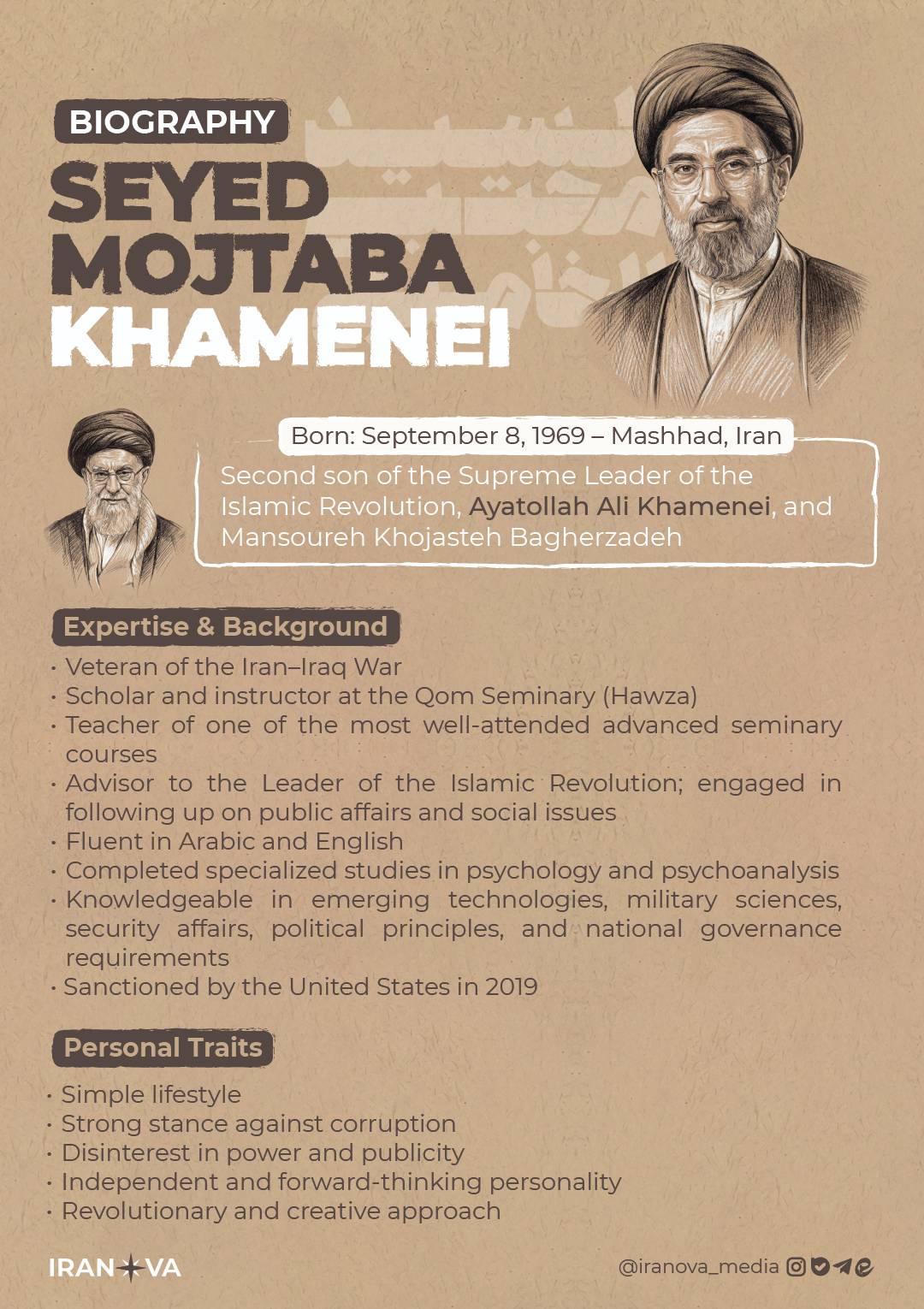 • Second son of the Supreme Leader of the Islamic Revolution, Ayatollah Ali Khamenei, and Mansoureh Khojasteh Bagherzadeh
